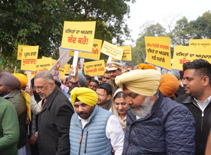 ਦਲਿਤਾਂ ਅਤੇ ਮਿਹਨਤਕਸ਼ਾਂ ਦਾ ਮਜ਼ਾਕ ਉਡਾਉਣ ‘ਤੇ ਕਾਂਗਰਸ ਖ਼ਿਲਾਫ਼ ਬੈਂਡ-ਵਾਜਿਆਂ ਨਾਲ ‘ਆਪ’ ਦਾ ਜ਼ੋਰਦਾਰ ਪ੍ਰਦਰਸ਼ਨ