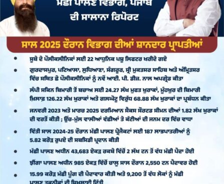 ਚੰਡੀਗੜ੍ਹ, 23 ਦਸੰਬਰ 2025 ਪੰਜਾਬ ਦੇ ਪਸ਼ੂ ਪਾਲਣ ਵਿਭਾਗ ਨੇ ਮੌਜੂਦਾ ਸਾਲ ਦੌਰਾਨ ਵੱਖ ਵੱਖ ਖੇਤਰਾਂ ਵਿੱਚ ਪ੍ਰਾਪਤੀਆਂ ਦਰਜ ਕਰਨ ਦੇ ਨਾਲ ਨਾਲ ਹੜ੍ਹਾਂ ਦੌਰਾਨ ਰਾਜ ਦੇ ਪਸ਼ੂਧਨ ਦੀ ਸੁਰੱਖਿਆ ਲਈ ਮਿਸਾਲੀ ਕੰਮ ਕੀਤੇ ਹਨ। ਪੰਜਾਬ ਦੇ ਪਸ਼ੂ ਪਾਲਣ, ਡੇਅਰੀ ਵਿਕਾਸ ਅਤੇ ਮੱਛੀ ਪਾਲਣ ਮੰਤਰੀ ਸ. ਗੁਰਮੀਤ ਸਿੰਘ ਖੁੱਡੀਆਂ ਨੇ ਦੱਸਿਆ ਕਿ ਸੂਬੇ 12 ਹੜ੍ਹ […]