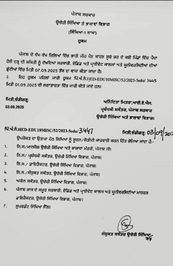 ਪੰਜਾਬ ਦੇ ਸਕੂਲ ਸਿੱਖਿਆ ਮੰਤਰੀ ਸ. ਹਰਜੋਤ ਸਿੰਘ ਬੈਂਸ ਨੇ ਦੱਸਿਆ ਕਿ ਹੜ੍ਹਾਂ ਦੀ ਮੌਜੂਦਾ ਸਥਿਤੀ ਨੂੰ ਵੇਖਦਿਆਂ ਸੂਬੇ ਦੇ ਸਾਰੇ ਸਰਕਾਰੀ, ਸਹਾਇਤਾ ਪ੍ਰਾਪਤ, ਮਾਨਤਾ ਪ੍ਰਾਪਤ ਅਤੇ ਪ੍ਰਾਈਵੇਟ ਸਕੂਲ 7 ਸਤੰਬਰ, 2025 ਤੱਕ ਬੰਦ ਰਹਿਣਗੇ।