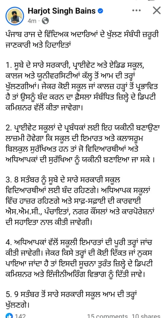 - ਸੂਬੇ ਦੇ ਸਾਰੇ ਸਰਕਾਰੀ, ਪ੍ਰਾਈਵੇਟ ਅਤੇ ਏਡਿਡ ਸਕੂਲ, ਕਾਲਜ ਅਤੇ ਯੂਨੀਵਰਸਿਟੀਆਂ ਕੱਲ੍ਹ ਤੋਂ ਆਮ ਦੀ ਤਰ੍ਹਾਂ ਖੁੱਲਣਗੀਆਂ। ਜੇਕਰ ਕੋਈ ਸਕੂਲ ਜਾਂ ਕਾਲਜ਼ ਹੜ੍ਹਾਂ ਤੋਂ ਪ੍ਰਭਾਵਿਤ ਹੈ ਤਾਂ ਉਸਨੂੰ ਬੰਦ ਕਰਨ ਦਾ ਫ਼ੈਸਲਾ ਸੰਬੰਧਿਤ ਜ਼ਿਲ੍ਹੇ ਦੇ ਡਿਪਟੀ ਕਮਿਸ਼ਨਰ ਵੱਲੋਂ ਕੀਤਾ ਜਾਵੇਗਾ।